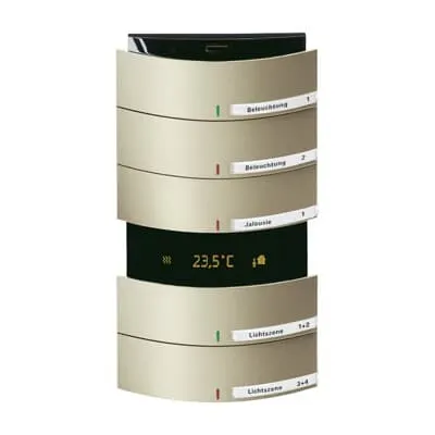 2CKA006320A0069 ABB: With integrated KNX bus coupler. With labelling field. Rocker switch left/right (switching/dimming/blind/value sender/light scenes/fan function). Master/slave configuration. With base-load operation. Control element with room thermostat function for triggering the heating, ventilation and fan-coil actuators. The controller is a constant room temperature controller for ventilator convectors (fan coils) in 2-pipe and 4-pipe systems and conventional heating or cooling systems. The fan stage can be switched manually or in automatic mode. Class of temperature controller 1 Contribution to space heating energy efficiency 1,0%.