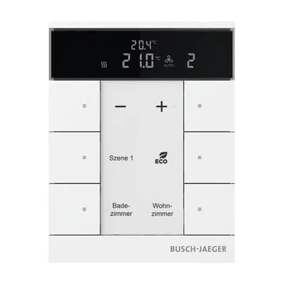 2CKA006330A0001 ABB: Freely configurable multifunction control element. Room temperature control/Controller extension with max. 6gang control With labelling field. Transparent labelling sheet with standard symbols included in delivery. Support of KNX functions through innovative colour concept (yellow=lighting, blue=blind, orange=RTC, magenta=scene and white=neutral/no function assigned) or standard illumination red/green. Rocker switch left/right (switching/dimming/blind/value sender/light scenes/fan function). With integrated temperature sensor. With actual value temperature display With display of set-value temperature. The bus can be connected via enclosed terminal block. With integrated KNX bus coupler. Number of bus subscribers: 1