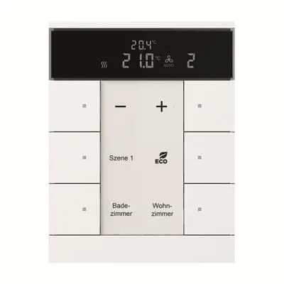 2CKA006330A0003 ABB: Freely configurable multifunction control element. With integrated KNX bus coupler. With labelling field. Support of KNX functions through innovative colour concept (yellow=lighting, blue=blind, orange=RTC, magenta=scene and white=neutral/no function assigned) or standard illumination red/green. Push switch function: switching / dimming / blind / sending values / scenes etc. For activating heating, ventilation and fan coil actuators. Master/slave configuration. With base-load operation. The fan stage can be switched manually or in automatic mode. Class of temperature controller 1 Contribution to space heating energy efficiency 1,0%. Number of bus subscribers: 1