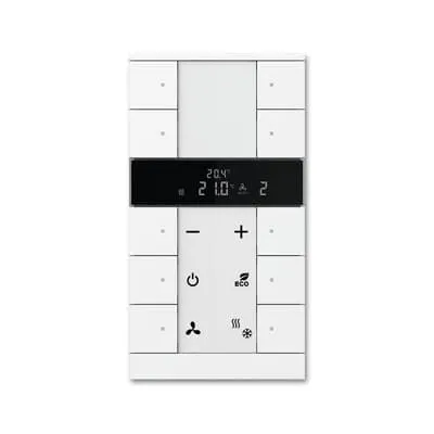 2CKA006330A0006 ABB: Freely configurable multifunction control element. Room temperature control/Controller extension with max. 10gang control With labelling field. Transparent labelling sheet with standard symbols included in delivery. Support of KNX functions through innovative colour concept (yellow=lighting, blue=blind, orange=RTC, magenta=scene and white=neutral/no function assigned) or standard illumination red/green. Rocker switch left/right (switching/dimming/blind/value sender/light scenes/fan function). With integrated temperature sensor. With actual value temperature display With display of set-value temperature. The bus can be connected via enclosed terminal block. With integrated KNX bus coupler. Number of bus subscribers: 1