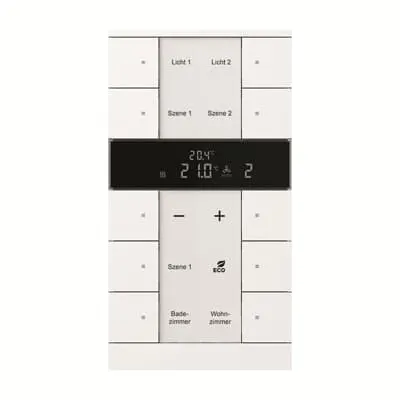 2CKA006330A0007 ABB: Freely configurable multifunction control element. With integrated KNX bus coupler. With labelling field. Support of KNX functions through innovative colour concept (yellow=lighting, blue=blind, orange=RTC, magenta=scene and white=neutral/no function assigned) or standard illumination red/green. Push switch function: switching / dimming / blind / sending values / scenes etc. Master/slave configuration. With base-load operation. The controller is a constant room temperature controller for ventilator convectors (fan coils) in 2-pipe and 4-pipe systems and conventional heating or cooling systems. The fan stage can be switched manually or in automatic mode. Class of temperature controller 1 Contribution to space heating energy efficiency 1,0%. Number of bus subscribers: 1
