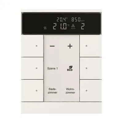 2CKA006330A0009 ABB: Control element with room temperature controller function and CO2/moisture sensor. With integrated KNX bus coupler. With labelling field. Support of KNX functions through innovative colour concept (yellow=lighting, blue=blind, orange=RTC, magenta=scene and white=neutral/no function assigned) or standard illumination red/green. Push switch function: switching / dimming / blind / sending values / scenes etc. For activating heating, ventilation and fan coil actuators. Master/slave configuration. With base-load operation. The fan stage can be switched manually or in automatic mode. Class of temperature controller 1 Contribution to space heating energy efficiency 1,0%. Number of bus subscribers: 2