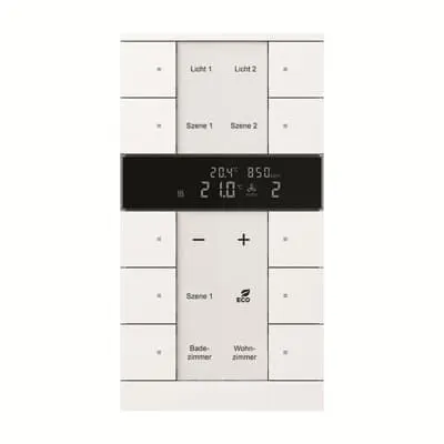 2CKA006330A0011 ABB: Control element with room temperature controller function and CO2/moisture sensor. With integrated KNX bus coupler. With labelling field. Support of KNX functions through innovative colour concept (yellow=lighting, blue=blind, orange=RTC, magenta=scene and white=neutral/no function assigned) or standard illumination red/green. Push switch function: switching / dimming / blind / sending values / scenes etc. For activating heating, ventilation and fan coil actuators. Master/slave configuration. With base-load operation. The fan stage can be switched manually or in automatic mode. Class of temperature controller 1 Contribution to space heating energy efficiency 1,0%. Number of bus subscribers: 2