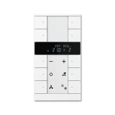 2CKA006330A0012 ABB: Control element with room temperature controller function and CO2/moisture sensor. With integrated KNX bus coupler. With labelling field. Support of KNX functions through innovative colour concept (yellow=lighting, blue=blind, orange=RTC, magenta=scene and white=neutral/no function assigned) or standard illumination red/green. Push switch function: switching / dimming / blind / sending values / scenes etc. For activating heating, ventilation and fan coil actuators. Master/slave configuration. With base-load operation. The fan stage can be switched manually or in automatic mode. Class of temperature controller 1 Contribution to space heating energy efficiency 1,0%. Number of bus subscribers: 2