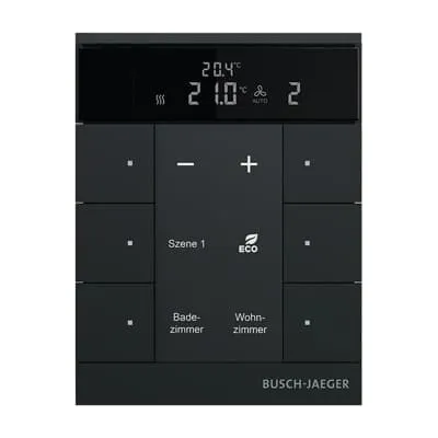 2CKA006330A0034 ABB: Freely configurable multifunction control element. Room temperature control/Controller extension with max. 6gang control With labelling field. Transparent labelling sheet with standard symbols included in delivery. Support of KNX functions through innovative colour concept (yellow=lighting, blue=blind, orange=RTC, magenta=scene and white=neutral/no function assigned) or standard illumination red/green. Rocker switch left/right (switching/dimming/blind/value sender/light scenes/fan function). With integrated temperature sensor. With actual value temperature display With display of set-value temperature. The bus can be connected via enclosed terminal block. With integrated KNX bus coupler. Number of bus subscribers: 1