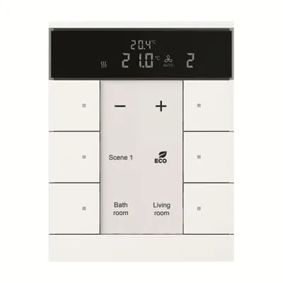 2CKA006330A0036 ABB: Freely configurable multifunction control element. Room temperature control/Controller extension with max. 6gang control With labelling field. Transparent labelling sheet with standard symbols included in delivery. Support of KNX functions through innovative colour concept (yellow=lighting, blue=blind, orange=RTC, magenta=scene and white=neutral/no function assigned) or standard illumination red/green. Rocker switch left/right (switching/dimming/blind/value sender/light scenes/fan function). With integrated temperature sensor. With actual value temperature display With display of set-value temperature. The bus can be connected via enclosed terminal block. With integrated KNX bus coupler. Number of bus subscribers: 1