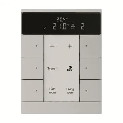 2CKA006330A0038 ABB: Freely configurable multifunction control element. Room temperature control/Controller extension with max. 6gang control With labelling field. Transparent labelling sheet with standard symbols included in delivery. Support of KNX functions through innovative colour concept (yellow=lighting, blue=blind, orange=RTC, magenta=scene and white=neutral/no function assigned) or standard illumination red/green. Rocker switch left/right (switching/dimming/blind/value sender/light scenes/fan function). With integrated temperature sensor. With actual value temperature display With display of set-value temperature. The bus can be connected via enclosed terminal block. With integrated KNX bus coupler. Number of bus subscribers: 1