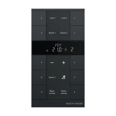 2CKA006330A0046 ABB: Freely configurable multifunction control element. Room temperature control/Controller extension with max. 10gang control With labelling field. Transparent labelling sheet with standard symbols included in delivery. Support of KNX functions through innovative colour concept (yellow=lighting, blue=blind, orange=RTC, magenta=scene and white=neutral/no function assigned) or standard illumination red/green. Rocker switch left/right (switching/dimming/blind/value sender/light scenes/fan function). With integrated temperature sensor. With actual value temperature display With display of set-value temperature. The bus can be connected via enclosed terminal block. With integrated KNX bus coupler. Number of bus subscribers: 1