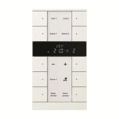 2CKA006330A0051 ABB: Freely configurable multifunction control element. With integrated KNX bus coupler. With labelling field. Support of KNX functions through innovative colour concept (yellow=lighting, blue=blind, orange=RTC, magenta=scene and white=neutral/no function assigned) or standard illumination red/green. Push switch function: switching / dimming / blind / sending values / scenes etc. Master/slave configuration. With base-load operation. The controller is a constant room temperature controller for ventilator convectors (fan coils) in 2-pipe and 4-pipe systems and conventional heating or cooling systems. The fan stage can be switched manually or in automatic mode. Class of temperature controller 1 Contribution to space heating energy efficiency 1,0%. Number of bus subscribers: 1