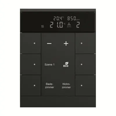 2CKA006330A0058 ABB: Control element with room temperature controller function and CO2/moisture sensor. With integrated KNX bus coupler. With labelling field. Support of KNX functions through innovative colour concept (yellow=lighting, blue=blind, orange=RTC, magenta=scene and white=neutral/no function assigned) or standard illumination red/green. Push switch function: switching / dimming / blind / sending values / scenes etc. For activating heating, ventilation and fan coil actuators. Master/slave configuration. With base-load operation. The fan stage can be switched manually or in automatic mode. Class of temperature controller 1 Contribution to space heating energy efficiency 1,0%. Number of bus subscribers: 2
