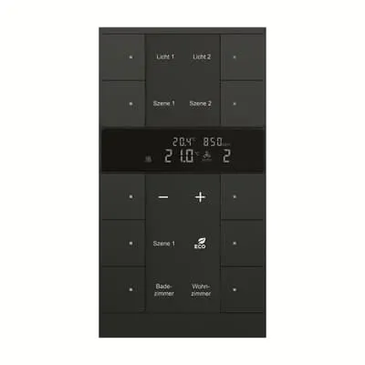 2CKA006330A0064 ABB: Control element with room temperature controller function and CO2/moisture sensor. With integrated KNX bus coupler. With labelling field. Support of KNX functions through innovative colour concept (yellow=lighting, blue=blind, orange=RTC, magenta=scene and white=neutral/no function assigned) or standard illumination red/green. Push switch function: switching / dimming / blind / sending values / scenes etc. For activating heating, ventilation and fan coil actuators. Master/slave configuration. With base-load operation. The fan stage can be switched manually or in automatic mode. Class of temperature controller 1 Contribution to space heating energy efficiency 1,0%. Number of bus subscribers: 2