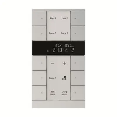2CKA006330A0068 ABB: Control element with room temperature controller function and CO2/moisture sensor. With integrated KNX bus coupler. With labelling field. Support of KNX functions through innovative colour concept (yellow=lighting, blue=blind, orange=RTC, magenta=scene and white=neutral/no function assigned) or standard illumination red/green. Push switch function: switching / dimming / blind / sending values / scenes etc. For activating heating, ventilation and fan coil actuators. Master/slave configuration. With base-load operation. The fan stage can be switched manually or in automatic mode. Class of temperature controller 1 Contribution to space heating energy efficiency 1,0%. Number of bus subscribers: 2