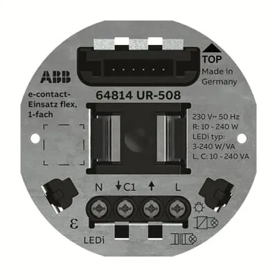 Feature: Flush-mounted, 1-gang design enables a compact footprint in tight installation spaces. Benefit: Reduces wall cavity crowding and simplifies retrofits in commercial lighting projects, delivering a cleaner install and faster commissioning for facilities teams. Application: Ideal for 1-gang wall boxes in offices and retail where discrete controls are preferred. Feature: 230 V, 1 A rated load with 50 Hz operation. Benefit: Supports standard lighting loads and small circuits with predictable performance, improving reliability and energy management. Application: Suitable for lighting control in flush-mounted switch insert applications with push-button inputs. Feature: 1 output, 1 input, with pin connection and screw terminals. Benefit: Flexible wiring options and secure terminations minimize field wiring errors and maintenance time. Application: Useful when upgrading legacy controls or integrating with ABB Comfort switch flex modules. Feature: Maximum switching power up to 240 VA / 240 W and minimum switching capacity of 3 W. Benefit: Handles a broad range of lamp types from LEDs to incandescents, ensuring consistent performance and reduced nuisance trips. Application: Approved for universal and LED retrofit loads. Feature: No control unit required; part of the flexTronics / free@home ecosystem. Benefit: Lowers total cost of ownership by removing extra components and enabling rapid deployment. Application: Works with ABB extension inserts such as 64891 UR-508 and compatible sensors. Feature: Operational range -5 to +45 °C. Benefit: Delivers reliable performance in common indoor environments without additional climate controls. Application: Suitable for office, retail, and commercial buildings where ambient temps remain stable.