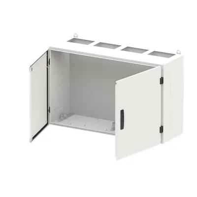 2CPX010143R9999 ABB: Wall-mounting cabinet, series TwinLine, empty cabinet, Expansion option: Lateral and bottom, for the internal use, with Door, class of protection I (earthed), degree of protection IP55, applicable standards: EN 61439-1, EN 61439-2, EN 61439-3, Impact strength IK08, Powder-coated, in RAL 7035, enclosure out of sheet steel, double door, door out of sheet steel, with Standard locking mechanism double bit, door opening angle 180 degree, door hinge right and left, rear wall out of sheet steel, cable entry on top via flange opening pre-cut, on bottom via flange opening pre-punched, on side via flange opening pre-punched, dimensions in mm (H x W x D): 650 x 1050 x 350, Grid unit 4 GU, Overall height 0, panel width 4, Space units 192, pre-assembled for installation of metering-, modules, Combi-Sets, CombiLine-Module, mounting plates on EDF-/WR-mounting frame