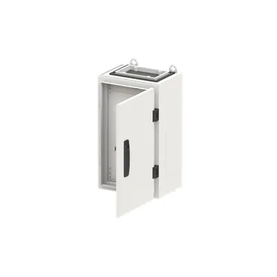 2CPX010448R9999 ABB: Feed-in enclosure, series TwinLine, door, Expansion option: bottom, for the internal use, with Door, class of protection II (double insulated), degree of protection IP55, Powder-coated, in RAL 7035, enclosure out of sheet steel, single-leaf door, door out of sheet steel, with Standard locking mechanism double bit, door opening angle 180 degree, rear wall out of sheet steel, dimensions in mm (H x W x D): 500 x 300 x 225, Grid unit 3 GU, Overall height 00, panel width 1, Space units 36, cable fastening rail integrated