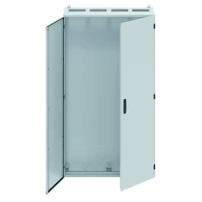 2CPX010979R9999 ABB: Floor-standing cabinet, series TwinLine, empty cabinet, Expansion option: Lateral, for the internal use, Enclosure with open side and door, class of protection II (double insulated), degree of protection IP55, applicable standards: EN 61439-1, EN 61439-2, EN 61439-3, Impact strength IK08, Powder-coated, in RAL 7035, enclosure out of sheet steel, double door, door out of sheet steel, with Standard locking mechanism double bit, door opening angle 180 degree, door hinge right or left, rear wall out of sheet steel, cable entry on top via flange opening pre-cut, on bottom via flange opening pre-punched, dimensions in mm (H x W x D): 1850 x 1050 x 400, Grid unit 12 GU, Overall height 8, panel width 4, Space units 576, pre-assembled for installation of CombiLine-Modules on WR-mounting frame