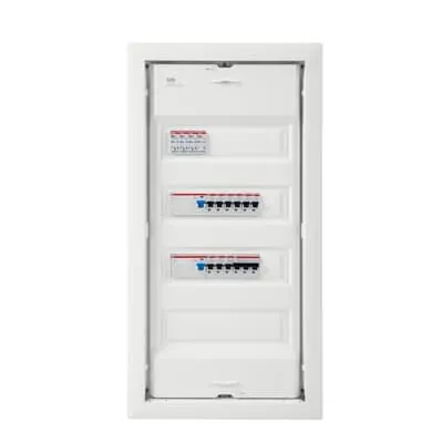 2CPX030004R9999 ABB: Prewired Consumer Unit, series UK600, Expansion option: Lateral and bottom, for the internal use, with closed doorframe and door, class of protection II (double insulated), degree of protection IP30, Impact strength IK07, Rated operational voltage 400V AC 50/60 Hz, rated current 63 A, Glow wire resistance 850°C, Powder-coated, in RAL 9016, enclosure out of thermoplast, with trim frame and metal door, door out of sheet steel, in RAL 9016, with TIP-in closure, door opening angle 120 degree, door hinge right or left, cable entry on top via cable entry slide part is pre-punched, on bottom via cable entry slide part is pre-punched, on side via pre-punched, rear wall pre-punched, dimensions in mm (H x W x D): 747 x 384 x 97, Shutter frame dimensions in mm (H x W x D): 747 x 384 x 9, Space units 48, Row distance in mm: 125, covers out of Plastic, 90 degree press and turn closure, with N/PE Quick-terminal, cable fastening rail integrated, device support removable