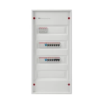 2CPX030010R9999 ABB: Prewired Consumer Unit, partly assembled, for the internal use, without door, class of protection II (double insulated), degree of protection IP30, Impact strength IK07, Rated operational voltage 400V AC 50/60 Hz, rated current 63 A, Glow wire resistance 750°C, Untreated, in RAL 9016, enclosure out of thermoplast, without door, door opening angle 120 degree, door hinge right or left, cable entry on top via pre-punched, on bottom via pre-punched, on side via pre-punched, rear wall pre-punched, dimensions in mm (H x W x D): 703 x 339 x 99, Space units 48, Row distance in mm: 125, covers out of Plastic, Quick sealable connection, with N/PE Quick-terminal, cable fastening rail integrated, device support removable