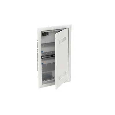 2CPX031455R9999 ABB: Multimedia unit, series UK600, Expansion option: Lateral and bottom, for the internal use, with closed doorframe and door, class of protection II (double insulated), degree of protection IP30, applicable standards: EN 60670-24, Impact strength IK07, Rated operational voltage 400V AC 50/60 Hz, rated current 63 A, Glow wire resistance 850°C, Powder-coated, in RAL 9016, enclosure out of thermoplast, with frame and ventilated door , door out of sheet steel, in RAL 9016, with TIP-in closure, door opening angle 120 degree, door hinge right or left, cable entry on top via cable entry slide part is pre-punched, on bottom via cable entry slide part is pre-punched, on side via pre-punched, rear wall pre-punched, dimensions in mm (H x W x D): 622 x 384 x 97, Shutter frame dimensions in mm (H x W x D): 622 x 384 x 9, Space units 36, cable fastening rail integrated, assembled with perforated sheet steel mounting plate and DIN rail