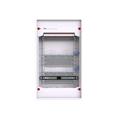 2CPX031811R9999 ABB: Multimedia unit, partly assembled, for the internal use, without door, class of protection II (double insulated), degree of protection IP00, applicable standards: EN 60670-24, Impact strength IK07, Rated operational voltage 400V AC 50/60 Hz, Glow wire resistance 750°C, Untreated, in RAL 9016, enclosure out of thermoplast, without door, in RAL 9016, door opening angle 120 degree, door hinge right or left, cable entry on top via pre-punched, on bottom via pre-punched, on side via pre-punched, rear wall pre-punched, dimensions in mm (H x W x D): 578 x 339 x 99, Space units 48, Row distance in mm: 125, covers out of Plastic, Quick sealable connection, without N/PE without terminal, cable fastening rail integrated, assembled with perforated sheet steel mounting plate, patchpanel an rotatable tripple socket outlet, device support removable