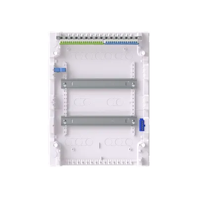 2CPX032569R9999 ABB: Consumer unit, partly assembled, for the internal use, without door, class of protection II (double insulated), degree of protection IP30, applicable standards: EN 60670-24, Impact strength IK07, Rated operational voltage 400V AC 50/60 Hz, rated current 63 A, Glow wire resistance 750°C, Untreated, in RAL 9016, enclosure out of thermoplast, without door, in RAL 9016, door opening angle 120 degree, door hinge right or left, cable entry on top via pre-punched, on bottom via pre-punched, on side via pre-punched, rear wall pre-punched, dimensions in mm (H x W x D): 453 x 339 x 99, Space units 24, Row distance in mm: 125, covers out of Plastic, Quick sealable connection, with N/PE screw terminal, cable fastening rail integrated, Assembled with DIN-rail, device support removable