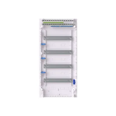 2CPX032571R9999 ABB: Consumer unit, partly assembled, for the internal use, without door, class of protection II (double insulated), degree of protection IP30, applicable standards: EN 60670-24, Impact strength IK07, Rated operational voltage 400V AC 50/60 Hz, rated current 63 A, Glow wire resistance 750°C, Untreated, in RAL 9016, enclosure out of thermoplast, without door, in RAL 9016, door opening angle 120 degree, door hinge right or left, cable entry on top via pre-punched, on bottom via pre-punched, on side via pre-punched, rear wall pre-punched, dimensions in mm (H x W x D): 703 x 339 x 99, Space units 48, Row distance in mm: 125, covers out of Plastic, Quick sealable connection, with N/PE screw terminal, cable fastening rail integrated, Assembled with DIN-rail, device support removable