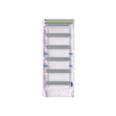 2CPX032572R9999 ABB: Consumer unit, partly assembled, for the internal use, without door, class of protection II (double insulated), degree of protection IP30, applicable standards: EN 60670-24, Impact strength IK07, Rated operational voltage 400V AC 50/60 Hz, rated current 63 A, Glow wire resistance 750°C, Untreated, in RAL 9016, enclosure out of thermoplast, without door, in RAL 9016, door opening angle 120 degree, door hinge right or left, cable entry on top via pre-punched, on bottom via pre-punched, on side via pre-punched, rear wall pre-punched, dimensions in mm (H x W x D): 828 x 339 x 99, Space units 60, Row distance in mm: 125, covers out of Plastic, Quick sealable connection, with N/PE screw terminal, cable fastening rail integrated, Assembled with DIN-rail, device support removable
