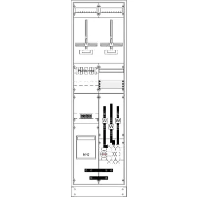 2CPX032975R9999 ABB: Measurement and metering transformer cabinet, series TwinLine, fully assembled cabinet, with Metering cross, for the internal use, with Door, class of protection II (double insulated), degree of protection IP55, applicable standards: EN 61439-1, Rated operational voltage 415V AC 50/60 Hz, rated current 320 A, Rated current of the assembly of switchgear and controlgear InA 400 A, Powder-coated, in RAL 7035, enclosure out of sheet steel, single-leaf door, door hinge right or left, dimensions in mm (H x W x D): 1950 x 550 x 225, Earthing system TN-S, 5-pole, Number of SG spaces 1, Number of transformer meter spaces 1, Pre-wired according requirements DSO, voltage path Fuse base element D01/3-pole sealable, parting point before the current transformer Fuse switch disconnector NH2/400 A, terminal screws M12, current transformer range CT mounting pad with CT rail 30 x 10 mm, parting point after the current transformer Switch 400 A / 3-pole (M10), primary wiring Cu-Busbar 30 x 5 mm, Connection N+PE (M10), Grid unit 12 GU, Overall height 8, panel width 2, Space units 288, covers out of Plastic, Quick sealable connection, RAL 7035