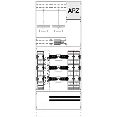 2CPX032977R9999 ABB: Measurement and metering transformer cabinet, series TwinLine, fully assembled cabinet, with Metering cross, for the internal use, with Door, class of protection I (earthed), degree of protection IP54, applicable standards: EN 61439-1, EN 61439-2, Rated operational voltage 415V AC 50/60 Hz, rated current 400 A, Rated current of the assembly of switchgear and controlgear InA 494 A, Powder-coated, in RAL 7035, enclosure out of sheet steel, single-leaf door, dimensions in mm (H x W x D): 1950 x 800 x 350, Earthing system TN-S, 5-pole, Number of SG spaces 1, Number of transformer meter spaces 1, Pre-wired according requirements DSO, voltage path 3 low voltage path switches B10/25kA overvoltage path category 3, busbar system Cu busbars 60 x 10 mm 5-pole, parting point before the current transformer Fuse disconnector NH3/630 A with double V-terminals, current transformer range CT mounting pad with CT rail, nickel plated, 250 x 40 x 10 mm, parting point after the current transformer 2 Fuse disconnector NH2/400 A, PE+N-busbar Cu 40 x 10 mm, Grid unit 12 GU, Overall height 8, panel width 3, Space units 432, covers out of Plastic, Quick sealable connection, RAL 7035