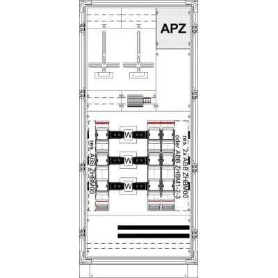 2CPX032978R9999 ABB: Measurement and metering transformer cabinet, series TriLine, fully assembled cabinet, with Metering cross, for the internal use, with Door, class of protection I (earthed), degree of protection IP54, applicable standards: EN 61439-1, EN 61439-2, Rated operational voltage 415V AC 50/60 Hz, rated current 420 A, Rated current of the assembly of switchgear and controlgear InA 504 A, Powder-coated, in RAL 7035, enclosure out of sheet steel, single-leaf door, dimensions in mm (H x W x D): 2013 x 874 x 425, Earthing system TN-S, 5-pole, Number of SG spaces 1, Number of transformer meter spaces 1, Pre-wired according requirements DSO, voltage path 3 low voltage path switches B10/25kA overvoltage path category 3, busbar system Cu busbars 60 x 10 mm 5-pole, parting point before the current transformer Fuse disconnector NH3/630 A with double V-terminals, current transformer range CT mounting pad with CT rail, nickel plated, 250 x 40 x 10 mm, parting point after the current transformer 2 Fuse disconnector NH2/400 A, PE+N-busbar Cu 40 x 10 mm, Grid unit 12 GU, Overall height 8, panel width 3, Space units 432, covers out of Plastic, Quick sealable connection, RAL 7035