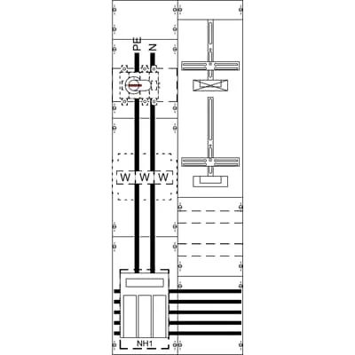 Plan for a TN-S earthing scheme with a 5-pole arrangement, 216 DIN units, and Cu busbars 12 × 5 mm. Note that the secondary wiringset is DSOs’ responsibility and busbar terminals must be ordered separately. The design includes quick-sealable connections and plastic covers for efficient, reliable assembly in factory or field installations.