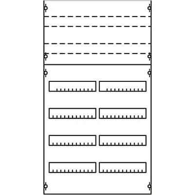 2CPX037625R9999 ABB: Interior fitting system, Distribution panels, mounted on EDF-Profile, for DIN rail devices and DIN rail terminals, Grid unit 6 GU = 900 mm, panel width 2 = 500 mm, 144 Space units, Row distance in mm: 125, assembled with DIN rail 35 x 15 mm with perforation for wire holders, covers out of Plastic, 90 degree press and turn closure, RAL 7035, Design of the cover: with cut-out, usuable as of the cabinet depth of 120 mm, distribution panels or combinations must have the same grid units as the cabinets, in which they are installed. For floor standing and switch gear cabinets, two panels or combinations must be installed next to each other. The EDF profile rails are included in the scope of delivery.