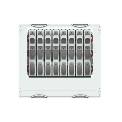 2CPX042111R9999 ABB: Interior fitting module, CombiLine, mounted in cabinet, for Busbar system 100 mm NH00-disconnector, Grid unit 3 GU = 450 mm, panel width 2 = 500 mm, 72 Space units, , usuable width of 400 mm, equipped with 8 NH-fuse disconnector NH00, Equipment manufacturer: ABB, InLine II ZLBM, for busbar system 3-pole, Busbar alignment: horizontal, with busbar holders ZX520, Busbar center distance: 100 mm, for maximum 3 Cu busbars, (busbars must be ordered separately), rated current maximum 850 A, covers out of Plastic, 90 degree press and turn closure, RAL 7035, Design of the cover: with cut-out, usuable as of the cabinet depth of 215 mm