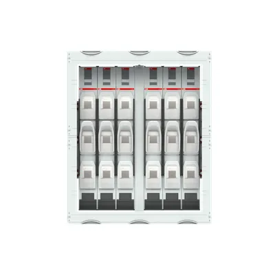 2CPX042254R9999 ABB: Interior fitting module, CombiLine, mounted in cabinet, for Busbar system 185 mm NH-disconnector, Grid unit 6 GU = 900 mm, panel width 3 = 750 mm, 180 Space units, , usuable width of 600 mm, equipped with 6 NH-fuse disconnector NH1, Equipment manufacturer: ABB, InLine II ZHBM + EFM, for busbar system 3-pole, Busbar alignment: horizontal, with busbar holders ZX522, Busbar center distance: 185 mm, for maximum 3 Cu busbars, (busbars must be ordered separately), rated current maximum 850 A, covers out of Plastic, 90 degree press and turn closure, RAL 7035, Design of the cover: with cut-out, usuable as of the cabinet depth of 275 mm