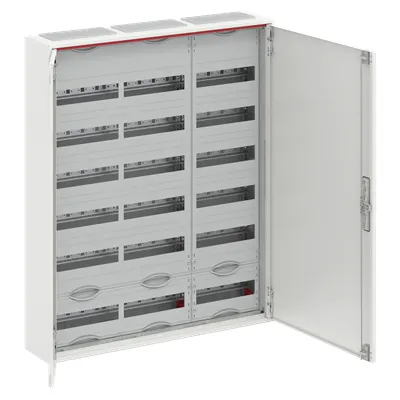 2CPX052192R9999 ABB: Compact distribution board, partly assembled cabinet, for the internal use, with Door, class of protection II (double insulated), in combination with earthing set (accessory) we can achieve protection class 1, degree of protection IP44, applicable standards: EN 61439-1, EN 61439-3, Impact strength IK07, Rated operational voltage 400V AC 50/60 Hz, rated current 125 A, Powder-coated, in RAL 9016, enclosure out of sheet steel, double door, door out of sheet steel, in RAL 9016, with Standard closure, door opening angle 120 degree, door hinge right and left, cable entry on top via membrane flange mounted, on bottom via flange opening pre-punched, dimensions in mm (H x W x D): 950 x 800 x 160, Grid unit 5 GU, panel width 3, Space units 216, Row distance in mm: 125, covers out of Plastic, 90 degree press and turn closure, RAL 7035, with N/PE Quick-terminal, cable fastening rail integrated, Assembled with distribution module, device support removable