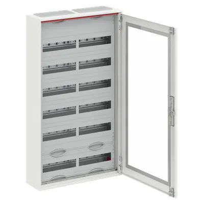 2CPX052204R9999 ABB: Compact distribution board, partly assembled cabinet, for the internal use, with Door, class of protection II (double insulated), in combination with earthing set (accessory) we can achieve protection class 1, degree of protection IP44, applicable standards: EN 61439-1, EN 61439-3, Impact strength IK07, Rated operational voltage 400V AC 50/60 Hz, rated current 125 A, Powder-coated, in RAL 9016, enclosure out of sheet steel, transparent door, door out of sheet steel, in RAL 9016, with Standard closure, door opening angle 120 degree, door hinge right or left, cable entry on top via membrane flange mounted, on bottom via flange opening pre-punched, dimensions in mm (H x W x D): 950 x 550 x 160, Grid unit 6 GU, panel width 2, Space units 144, Row distance in mm: 125, covers out of Plastic, 90 degree press and turn closure, RAL 7035, with N/PE Quick-terminal, cable fastening rail integrated, Assembled with distribution module, device support removable