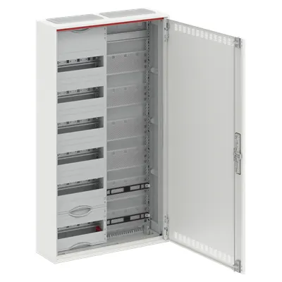 2CPX052213R9999 ABB: Compact distribution board, partly assembled cabinet, for the internal use, with Door, class of protection II (double insulated), in combination with earthing set (accessory) we can achieve protection class 1, degree of protection IP30, applicable standards: EN 61439-1, EN 61439-3, Impact strength IK07, Rated operational voltage 400V AC 50/60 Hz, rated current 125 A, Powder-coated, in RAL 9016, enclosure out of sheet steel, ventilated metal door, door out of sheet steel, in RAL 9016, with Standard closure, door opening angle 120 degree, door hinge right or left, cable entry on top via membrane flange mounted, on bottom via flange opening pre-punched, dimensions in mm (H x W x D): 950 x 550 x 160, Grid unit 6 GU, panel width 2, Space units 72, Row distance in mm: 125, covers out of Plastic, 90 degree press and turn closure, RAL 7035, with N/PE Quick-terminal, cable fastening rail integrated, Assembled with distribution module + multimedia module, device support removable
