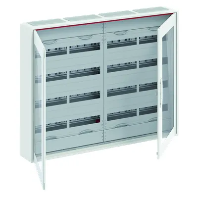2CPX052262R9999 ABB: Compact distribution board, partly assembled cabinet, for the internal use, with Door, class of protection II (double insulated), in combination with earthing set (accessory) we can achieve protection class 1, degree of protection IP44, applicable standards: EN 61439-1, EN 61439-3, Impact strength IK07, Rated operational voltage 400V AC 50/60 Hz, rated current 125 A, Powder-coated, in RAL 9016, enclosure out of sheet steel, transparent door, door out of sheet steel, in RAL 9016, with Standard closure, door opening angle 120 degree, door hinge right and left, cable entry on top via membrane flange mounted, on bottom via flange opening pre-punched, dimensions in mm (H x W x D): 800 x 1050 x 160, Grid unit 5 GU, panel width 4, Space units 192, Row distance in mm: 150, covers out of Plastic, 90 degree press and turn closure, RAL 7035, with N/PE Quick-terminal, cable fastening rail integrated, Assembled with distribution module, device support removable