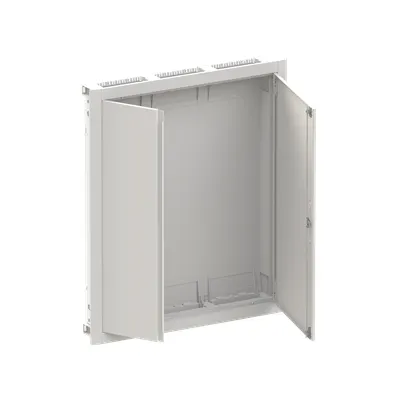 2CPX052643R9999 ABB: Compact distribution board, series ComfortLine, empty cabinet, for the internal use, with closed doorframe and door, class of protection II (double insulated), in combination with earthing set (accessory) we can achieve protection class 1, degree of protection IP30, applicable standards: EN 61439-1, EN 61439-3, Impact strength IK09, Rated operational voltage 400V AC 50/60 Hz, rated current 125 A, Powder-coated, in RAL 9016, enclosure out of sheet steel, double door, door out of sheet steel, in RAL 9016, with Standard closure, door opening angle 120 degree, door hinge right and left, cable entry on top via cable entry slide part is pre-punched, on bottom via cable entry slide part is pre-punched, dimensions in mm (H x W x D): 1014 x 865 x 125, Shutter frame dimensions in mm (H x W x D): 1014 x 865 x 15, 15 mm, possible plaster compensation up to 25 mm, Grid unit 6 GU, panel width 3, Space units 216, without N/PE Quick-terminal, cable fastening rail integrated, pre-assembled for installation of modules and CombiLine Modules
