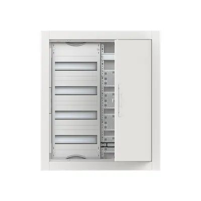 2CPX052664R9999 ABB: Compact distribution board, series ComfortLine, partly assembled cabinet, for the internal use, with closed doorframe and door, class of protection II (double insulated), in combination with earthing set (accessory) we can achieve protection class 1, degree of protection IP30, applicable standards: EN 61439-1, EN 61439-3, Impact strength IK09, Rated operational voltage 400V AC 50/60 Hz, rated current 125 A, Powder-coated, in RAL 9016, enclosure out of sheet steel, metal door , door out of sheet steel, in RAL 9016, with Standard closure, door opening angle 120 degree, door hinge right or left, cable entry on top via cable entry slide part is pre-punched, on bottom via cable entry slide part is pre-punched, dimensions in mm (H x W x D): 714 x 615 x 125, Shutter frame dimensions in mm (H x W x D): 714 x 615 x 15, 15 mm, possible plaster compensation up to 25 mm, Grid unit 4 GU, panel width 2, Space units 48, Row distance in mm: 125, covers out of Plastic, 90 degree press and turn closure, RAL 7035, with N/PE Quick-terminal, cable fastening rail integrated, Assembled with distribution module + multimedia module, device support removable
