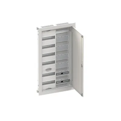 2CPX052666R9999 ABB: Compact distribution board, series ComfortLine, partly assembled cabinet, for the internal use, with closed doorframe and door, class of protection II (double insulated), in combination with earthing set (accessory) we can achieve protection class 1, degree of protection IP30, applicable standards: EN 61439-1, EN 61439-3, Impact strength IK09, Rated operational voltage 400V AC 50/60 Hz, rated current 125 A, Powder-coated, in RAL 9016, enclosure out of sheet steel, metal door , door out of sheet steel, in RAL 9016, with Standard closure, door opening angle 120 degree, door hinge right or left, cable entry on top via cable entry slide part is pre-punched, on bottom via cable entry slide part is pre-punched, dimensions in mm (H x W x D): 1014 x 615 x 125, Shutter frame dimensions in mm (H x W x D): 1014 x 615 x 15, 15 mm, possible plaster compensation up to 25 mm, Grid unit 6 GU, panel width 2, Space units 72, Row distance in mm: 125, covers out of Plastic, 90 degree press and turn closure, RAL 7035, with N/PE Quick-terminal, cable fastening rail integrated, Assembled with distribution module + multimedia module, device support removable