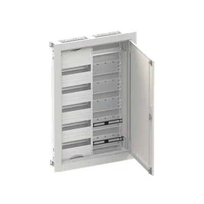 2CPX052672R9999 ABB: Compact distribution board, series ComfortLine, partly assembled cabinet, for the internal use, with closed doorframe and door, class of protection II (double insulated), in combination with earthing set (accessory) we can achieve protection class 1, degree of protection IP30, applicable standards: EN 61439-1, EN 61439-3, Impact strength IK09, Rated operational voltage 400V AC 50/60 Hz, rated current 125 A, Powder-coated, in RAL 9016, enclosure out of sheet steel, ventilated metal door, door out of sheet steel, in RAL 9016, with Standard closure, door opening angle 120 degree, door hinge right or left, cable entry on top via cable entry slide part is pre-punched, on bottom via cable entry slide part is pre-punched, dimensions in mm (H x W x D): 864 x 615 x 125, Shutter frame dimensions in mm (H x W x D): 864 x 615 x 15, 15 mm, possible plaster compensation up to 25 mm, Grid unit 5 GU, panel width 2, Space units 60, Row distance in mm: 125, covers out of Plastic, 90 degree press and turn closure, RAL 7035, with N/PE Quick-terminal, cable fastening rail integrated, Assembled with distribution module + multimedia module, device support removable