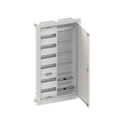 2CPX052673R9999 ABB: Compact distribution board, series ComfortLine, partly assembled cabinet, for the internal use, with closed doorframe and door, class of protection II (double insulated), in combination with earthing set (accessory) we can achieve protection class 1, degree of protection IP30, applicable standards: EN 61439-1, EN 61439-3, Impact strength IK09, Rated operational voltage 400V AC 50/60 Hz, rated current 125 A, Powder-coated, in RAL 9016, enclosure out of sheet steel, ventilated metal door, door out of sheet steel, in RAL 9016, with Standard closure, door opening angle 120 degree, door hinge right or left, cable entry on top via cable entry slide part is pre-punched, on bottom via cable entry slide part is pre-punched, dimensions in mm (H x W x D): 1014 x 615 x 125, Shutter frame dimensions in mm (H x W x D): 1014 x 615 x 15, 15 mm, possible plaster compensation up to 25 mm, Grid unit 6 GU, panel width 2, Space units 72, Row distance in mm: 125, covers out of Plastic, 90 degree press and turn closure, RAL 7035, with N/PE Quick-terminal, cable fastening rail integrated, Assembled with distribution module + multimedia module, device support removable