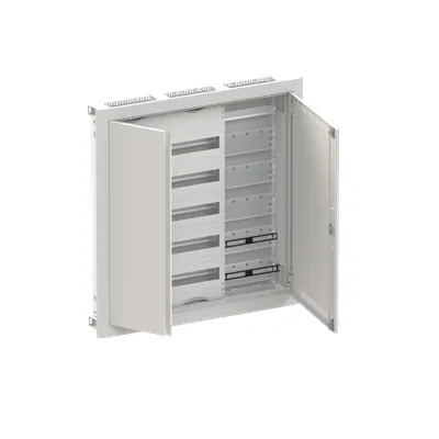 2CPX052676R9999 ABB: Compact distribution board, series ComfortLine, partly assembled cabinet, for the internal use, with closed doorframe and door, class of protection II (double insulated), in combination with earthing set (accessory) we can achieve protection class 1, degree of protection IP30, applicable standards: EN 61439-1, EN 61439-3, Impact strength IK09, Rated operational voltage 400V AC 50/60 Hz, rated current 125 A, Powder-coated, in RAL 9016, enclosure out of sheet steel, ventilated metal double door, door out of sheet steel, in RAL 9016, with Standard closure, door opening angle 120 degree, door hinge right and left, cable entry on top via cable entry slide part is pre-punched, on bottom via cable entry slide part is pre-punched, dimensions in mm (H x W x D): 864 x 865 x 125, Shutter frame dimensions in mm (H x W x D): 864 x 865 x 15, 15 mm, possible plaster compensation up to 25 mm, Grid unit 5 GU, panel width 3, Space units 120, Row distance in mm: 125, covers out of Plastic, 90 degree press and turn closure, RAL 7035, with N/PE Quick-terminal, cable fastening rail integrated, Assembled with distribution module + multimedia module, device support removable