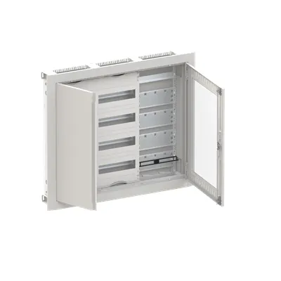 2CPX052682R9999 ABB: Compact distribution board, series ComfortLine, partly assembled cabinet, for the internal use, with closed doorframe and door, class of protection II (double insulated), in combination with earthing set (accessory) we can achieve protection class 1, degree of protection IP30, applicable standards: EN 61439-1, EN 61439-3, Impact strength IK07, Rated operational voltage 400V AC 50/60 Hz, rated current 125 A, Powder-coated, in RAL 9016, enclosure out of sheet steel, ventilated metal double door wifi, door out of sheet steel, in RAL 9016, with Standard closure, door opening angle 120 degree, door hinge right and left, cable entry on top via cable entry slide part is pre-punched, on bottom via cable entry slide part is pre-punched, dimensions in mm (H x W x D): 714 x 865 x 125, Shutter frame dimensions in mm (H x W x D): 714 x 865 x 15, 15 mm, possible plaster compensation up to 25 mm, Grid unit 4 GU, panel width 3, Space units 96, Row distance in mm: 125, covers out of Plastic, 90 degree press and turn closure, RAL 7035, with N/PE Quick-terminal, cable fastening rail integrated, Assembled with distribution module + multimedia module, device support removable