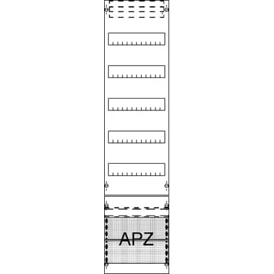 2CPX054007R9999 ABB: Distribution panel, suitable for series: ComfortLine, empty board, for DIN rail mounting devices, dimensions in mm (H x W x D): 1050 x 250 x 160, Grid unit 7 GU, Overall height 3, panel width 1, Space units 84, Row distance in mm: 125, covers out of Plastic, 90 degree press and turn closure, RAL 7035, with N/PE Quick-terminal