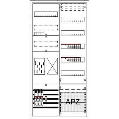 2CPX054233R9999 ABB: Meter board, series ComfortLine A, fully assembled cabinet, with BKE-I, Expansion option: Lateral, for the internal use, with Door, class of protection II (double insulated), degree of protection IP31, applicable standards: DIN VDE 0603-2-1, VDE AR-N 4100:2019-04, Impact strength IK07, Rated operational voltage 400V AC 50/60 Hz, rated current 63 A, Powder-coated, in RAL 9016, enclosure out of sheet steel, single-leaf door, door out of sheet steel, with Standard closure, door opening angle 120 degree, door hinge right or left, rear wall out of sheet steel / plastic, cable entry on top via membrane flange mounted, on bottom via 2x cable entry flange included, on side via flange opening pre-punched, rear wall cable entry part is pre-punched, dimensions in mm (H x W x D): 1100 x 550 x 215, Metering module pre-wired, Earthing system TN-S, 5-pole, Stecktechnik, net side compartment, meter space: with busbar, with 1x selective main circuit breaker E40A 3polig, incoming terminals up to 25 mm², system side compartment, meter space: with Main branch terminal, compartment for additional devices of eHZ 150 mm, Number of meter spaces single tariff 1, Number of reserve spaces 1, Number of distributor rows 5, Grid unit 7 GU, Overall height 3, panel width 2, Space units 168, covers out of Plastic, RAL 7035