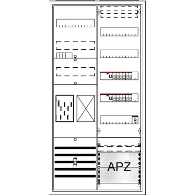2CPX054234R9999 ABB: Meter board, series ComfortLine A, fully assembled cabinet, with BKE-I, Expansion option: Lateral, for the internal use, with Door, class of protection II (double insulated), degree of protection IP31, applicable standards: DIN VDE 0603-2-1, VDE AR-N 4100:2019-04, Impact strength IK07, Rated operational voltage 400V AC 50/60 Hz, rated current 63 A, Powder-coated, in RAL 9016, enclosure out of sheet steel, single-leaf door, door out of sheet steel, with Standard closure, door opening angle 120 degree, door hinge right or left, rear wall out of sheet steel / plastic, cable entry on top via membrane flange mounted, on bottom via 2x cable entry flange included, on side via flange opening pre-punched, rear wall cable entry part is pre-punched, dimensions in mm (H x W x D): 1100 x 550 x 215, Metering module pre-wired, Earthing system TN-S, 5-pole, Stecktechnik, net side compartment, meter space: with busbar, pre-assembled for main switch SH, incoming terminals up to 25 mm², system side compartment, meter space: with Main branch terminal, compartment for additional devices of eHZ 150 mm, Number of meter spaces single tariff 1, Number of reserve spaces 1, Number of distributor rows 5, Grid unit 7 GU, Overall height 3, panel width 2, Space units 168, covers out of Plastic, RAL 7035