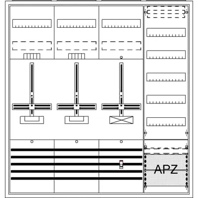 2CPX054258R9999 ABB: Meter board, series ComfortLine A, fully assembled cabinet, with Metering cross, Expansion option: Lateral, for the internal use, with Door, class of protection II (double insulated), degree of protection IP31, applicable standards: DIN VDE 0603-2-1, VDE AR-N 4100:2019-04, Impact strength IK07, Rated operational voltage 400V AC 50/60 Hz, rated current 63 A, Powder-coated, in RAL 9016, enclosure out of sheet steel, double door, door out of sheet steel, with Standard closure, door opening angle 120 degree, door hinge right and left, rear wall out of sheet steel / plastic, cable entry on top via membrane flange mounted, on bottom via 2x cable entry flange included, on side via flange opening pre-punched, rear wall cable entry part is pre-punched, dimensions in mm (H x W x D): 1100 x 1050 x 215, Metering module pre-wired, Earthing system TN-S, 5-pole, Direct connection, net side compartment, meter space: with busbar, pre-assembled for main switch SH, net side compartment, SG space: with Miniature circuit breaker 1-pole B10/25kA according DIN VDE 0660-101 sealable, incoming terminals up to 25 mm², system side compartment, meter space: with Main branch terminal, Number of meter spaces single tariff 2, Number of SG spaces 1, Number of distributor rows 5, Grid unit 7 GU, Overall height 3, panel width 4, Space units 336, covers out of Plastic, RAL 7035