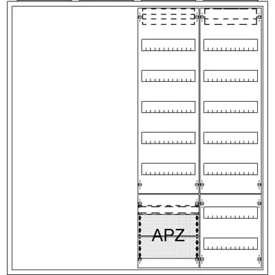 2CPX054296R9999 ABB: Meter expansion cabinet, series ComfortLine A, without meter panel, free panel width: 2, with distribution panels FV17A2 and FV17, universally usable throughout Germany, meter panel selection is made by the customer according to regional conditions, mounting type: wall-mounted, partially recessed, flush-mounted (with trim frame), for indoor use in residential, functional and industrial buildings, cable entry on top via membrane flange mounted, on bottom via 1x cable entry flange enclosed, on side via flange opening embossed, rear wall via cable entry embossed, dimensions in mm (H x W x D): 1100 x 1050 x 215, housing made of sheet steel, double door made of sheet steel, with standard lock, door opening angle 120 degrees, rear wall made of sheet steel / plastic, protection class IP44 (IP31 according to DIN VDE 0603-1), IK code 07, applicable standards: DIN VDE 0603-1, DIN 43870-1, color: white RAL 9016, powder coated, included in delivery: 5x busbar connection terminal (ZK79).